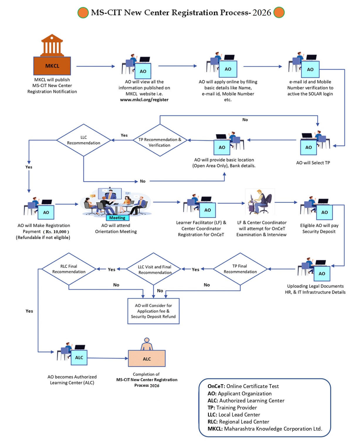- If the same Center Coordinator is already registered from existing MS-CIT ALC (as per record available on Solar), then MKCL will cancel the application of concerned AOs. Also, these AOs will not be eligible for further process.